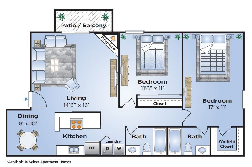2 Dormitorios, 1 Baño, 950 pies²Disponible AhoraGalería del Modelo