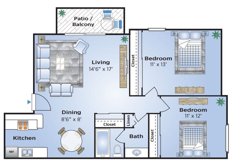Modelo de apartamento: The SaplingDesde $9991 Dormitorio, 1 Baño, 475 sq ftDisponible Ahora![]()