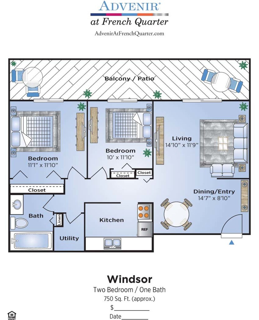 Modelo de apartamento: WindsorDesde $1,3992 Dormitorios, 1 Baño, 750 sq ftDisponible AhoraPlanosFotos![]()