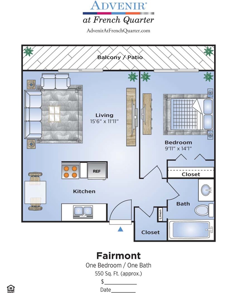 Modelo de apartamento: FairmontDesde $1,0991 Dormitorio, 1 Baño, 550 sq ftDisponible Ahora![]()