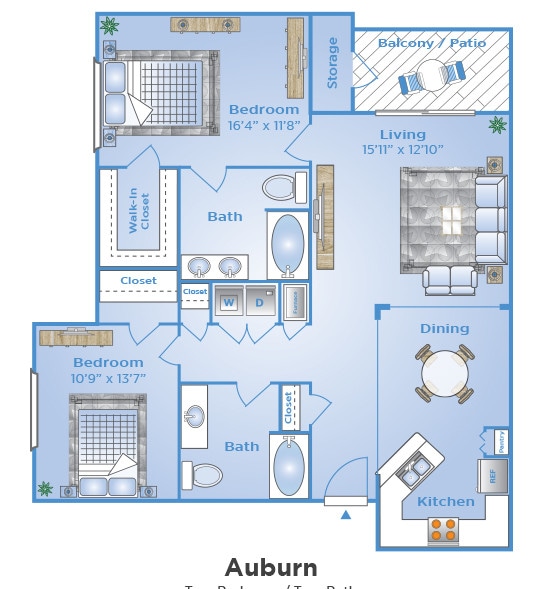 Modelo de apartamento: AuburnDesde $1,4402 Dormitorios, 2 Baños, 1172 sq ftDisponible AhoraPlanosFotos![]()
