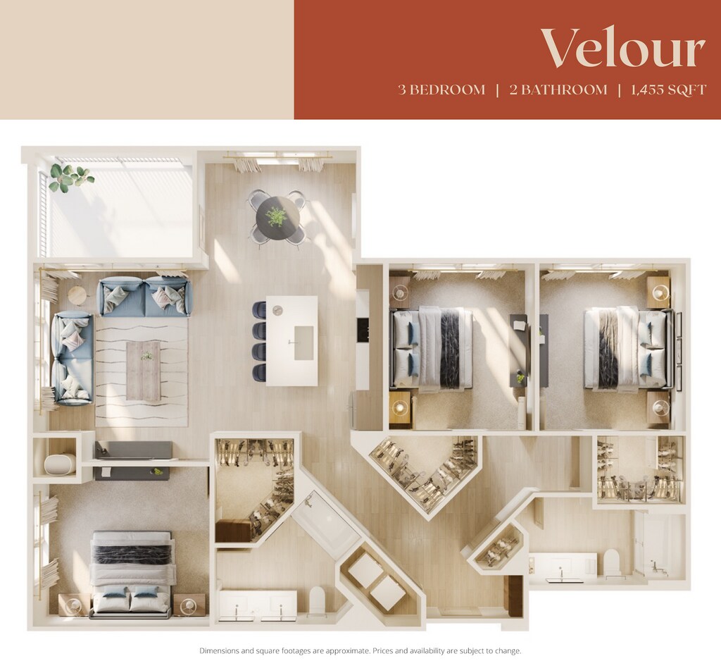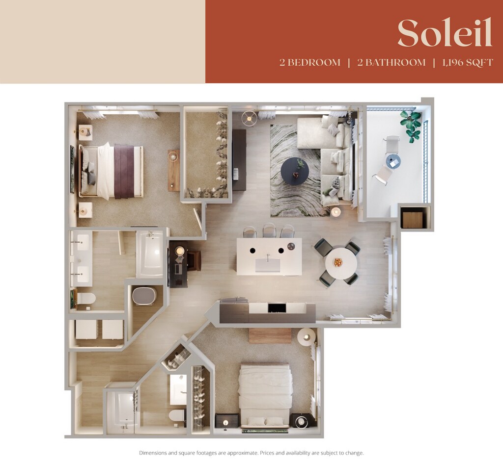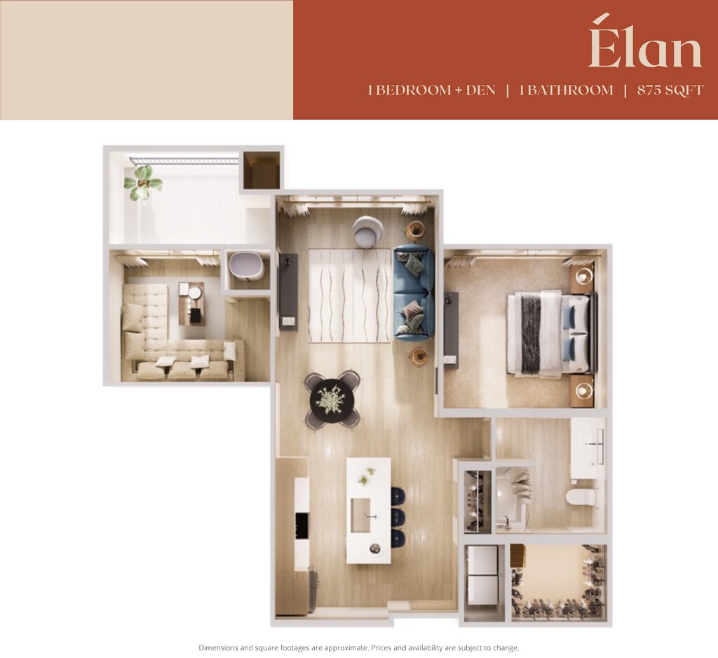 Modelo de apartamento: ÉlanLlame para Precios1 Dormitorio, 1 Baño, 875 sq ftNo Disponible![]()