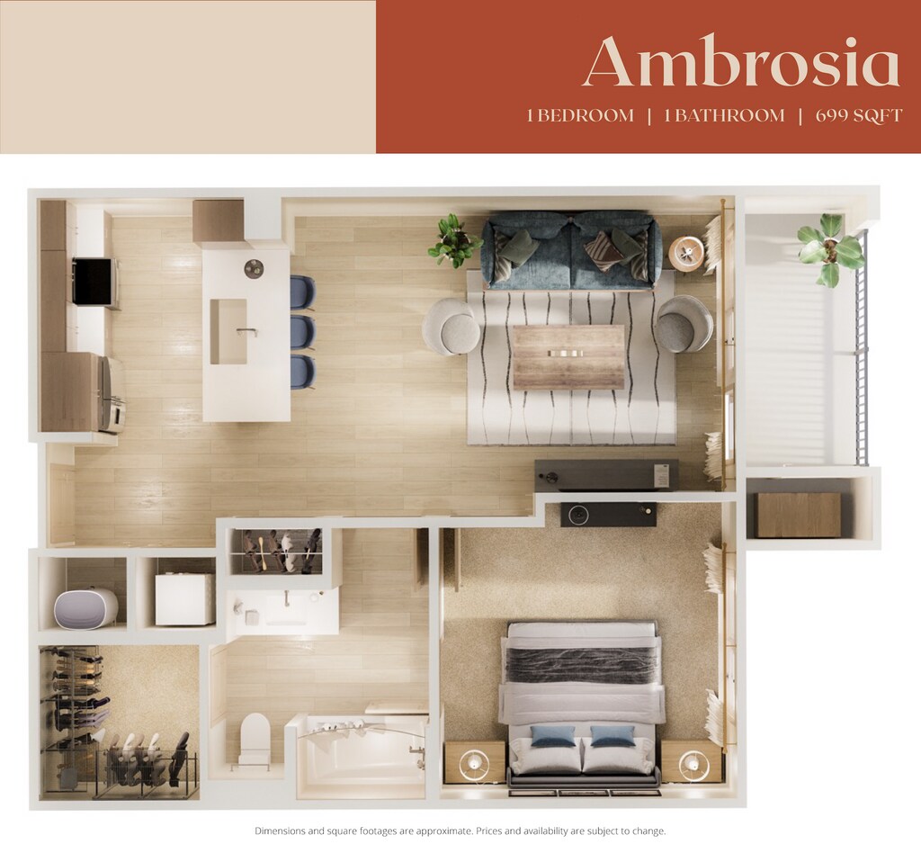 Modelo de apartamento: AmbrosiaDesde $1,5751 Dormitorio, 1 Baño, 699 sq ftDisponible Ahora![]()