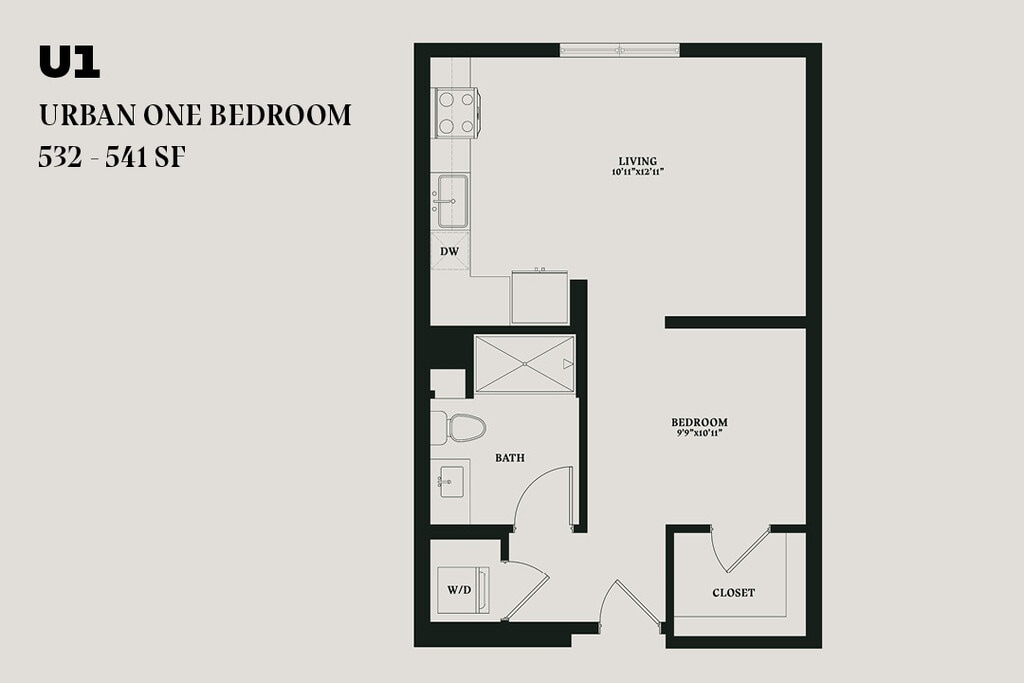 1 Dormitorio, 1 Baño, 532-541 pies²Disponible AhoraGalería del Modelo