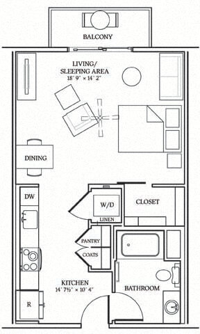 Modelo de apartamento: STUDIO 3$2,563Estudio, 1 Baño, 590 sq ftDisponible October 17, 2025Los planos de la planta son una interpretación artística. Todas las dimensiones son aproximadas. Los tamaños o el detalle del producto real y sus especificaciones pueden variar. No todas las características están disponibles en todos los hogares para rentar. Los precios y la disponibilidad están sujetos a cambios. El alquiler que se muestra es mensual. Se pueden aplicar ciertos cargos, por ejemplo, entrega de paquetes, recolección de basura, agua, servicios, etc. Depositos varian. Consulta a un representante para conocer detalles.