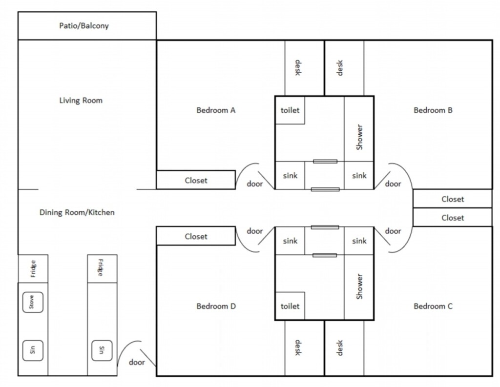 Fecha Disponibilidad Unidad Pies² Depósito No Disponible 1 bed shared bath in 4-bed suite 1319 pies² $700 Características y Comodidades de Modelo