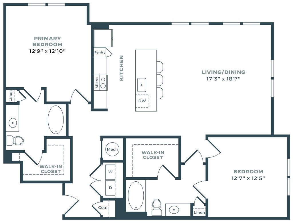 Modelo de apartamento: B2Desde $1,7992 Dormitorios, 2 Baños, 1310 sq ftDisponible Ahora![]()