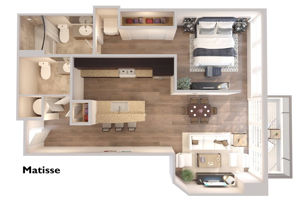 Modelo de apartamento: Matisse - 1 Bedroom 1.5 BathsDesde $1,8501 Dormitorio, 1.5 Baños, 761 sq ftDisponible Ahora![]()