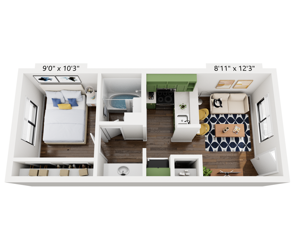 Modelo de apartamento: Alma Woodward - A1 - 1 Bed | 1 BathDesde $1,0951 Dormitorio, 1 Baño, 410 sq ftDisponible AhoraPlanosFotos![]()