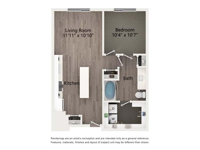 Modelo de apartamento: EA1Desde $1,566Estudio, 1 Baño, 565 sq ftDisponible AhoraLos planos son representaciones artísticas. Todas las dimensiones son aproximadas. El producto y las especificaciones reales pueden variar en tamaño o detalle. No todas las características están disponibles en cada vivienda en alquiler. Por favor, consulta con un representante para obtener más detalles.
