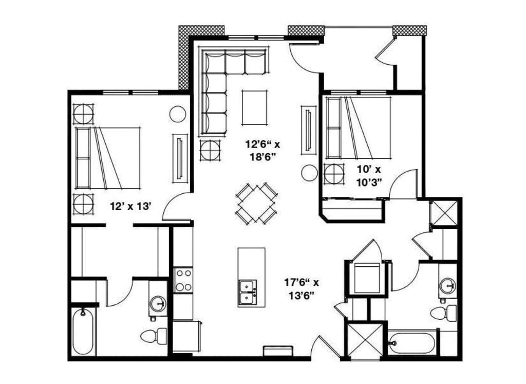 Modelo de apartamento: 2x2 G$1,6752 Dormitorios, 2 Baños, 1126 sq ftDisponible Ahora![]()