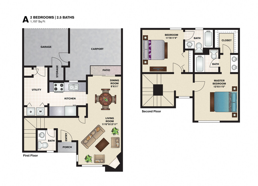 Modelo de apartamento: A2 Dormitorios, 2.5 Baños, 1157 sq ftDisponible Ahora![]()