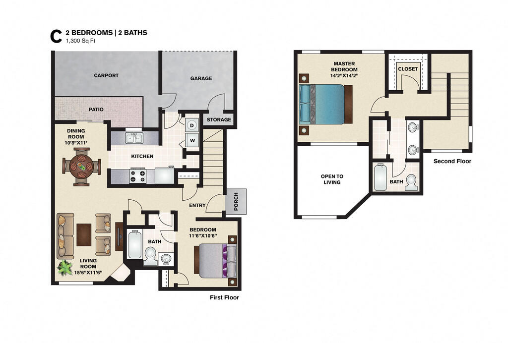 Modelo de apartamento: C2 Dormitorios, 2 Baños, 1300 sq ftDisponible Ahora![]()