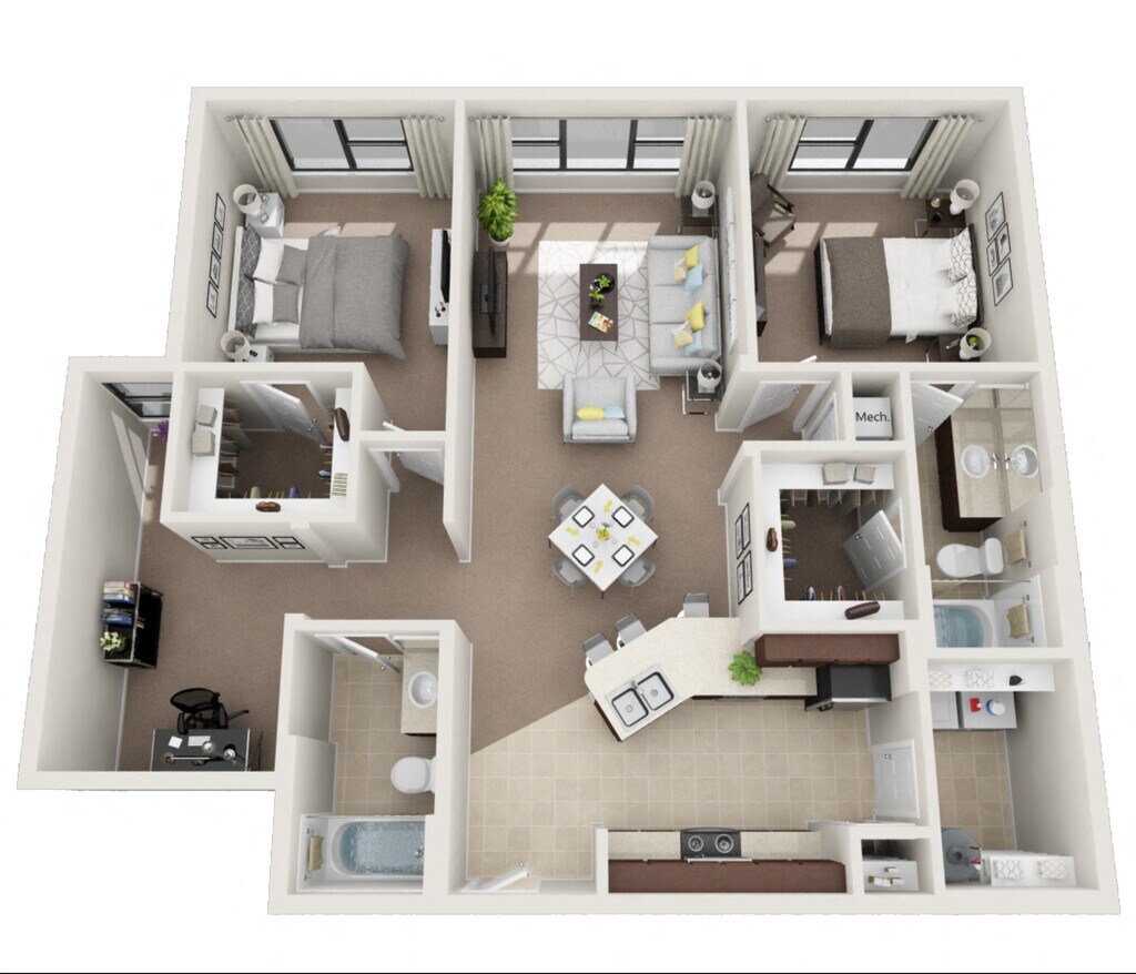 Modelo de apartamento: Two Bedroom Two Bathroom with Home OfficeDesde $1,6992 Dormitorios, 2 Baños, 1091 sq ftDisponible Ahora![]()
