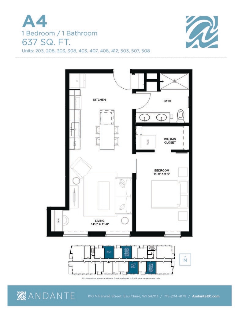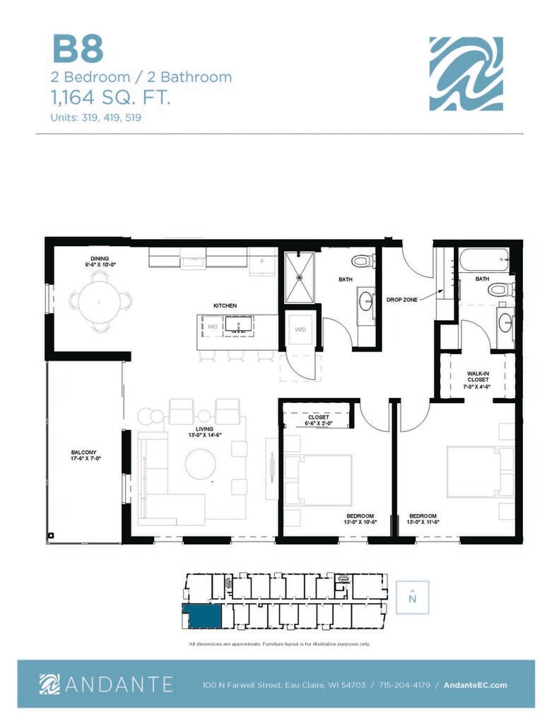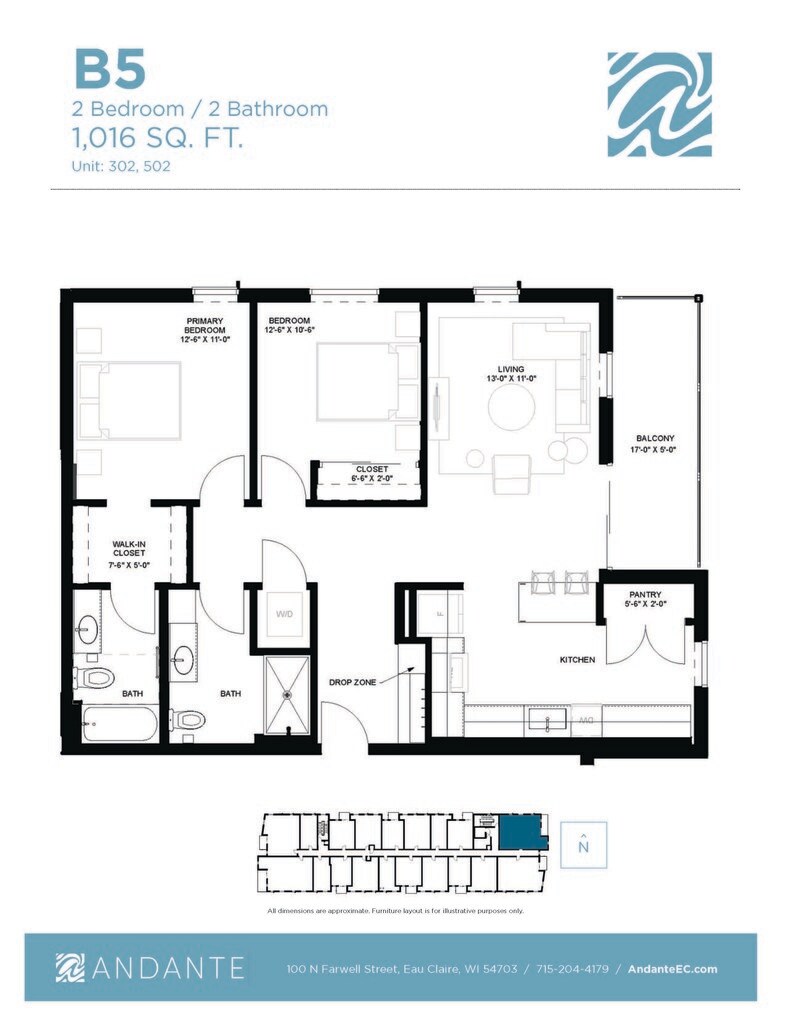 Andante es un desarrollo de uso mixto de 5 pisos ubicado en 100 N. Farwell Street, en el corazón del centro de Eau Claire. El proyecto incluye 76 apartamentos residenciales, que incluyen estudios amueblados, apartamentos de una habitación y apartamentos de dos habitaciones. El primer piso del edificio incluye más de 8,000 pies cuadrados de espacio comercial en alquiler. Vive de la manera en que siempre has querido sin comprometer el estilo o la calidad. Andante es un término musical que significa “un ritmo moderado para caminar”. Nuestras residencias de apartamentos y las características del complejo están diseñadas con eso en mente. Ubicado en el centro de la ciudad, directamente en Chippewa River State Trail, los residentes están a una caminata de distancia de muchas comodidades del complejo, como el mercado de productores, Pablo Center at the Confluence, restaurantes y tiendas locales y mucho más. Ahora realmente puedes tenerlo todo. estilo de vida incluido.