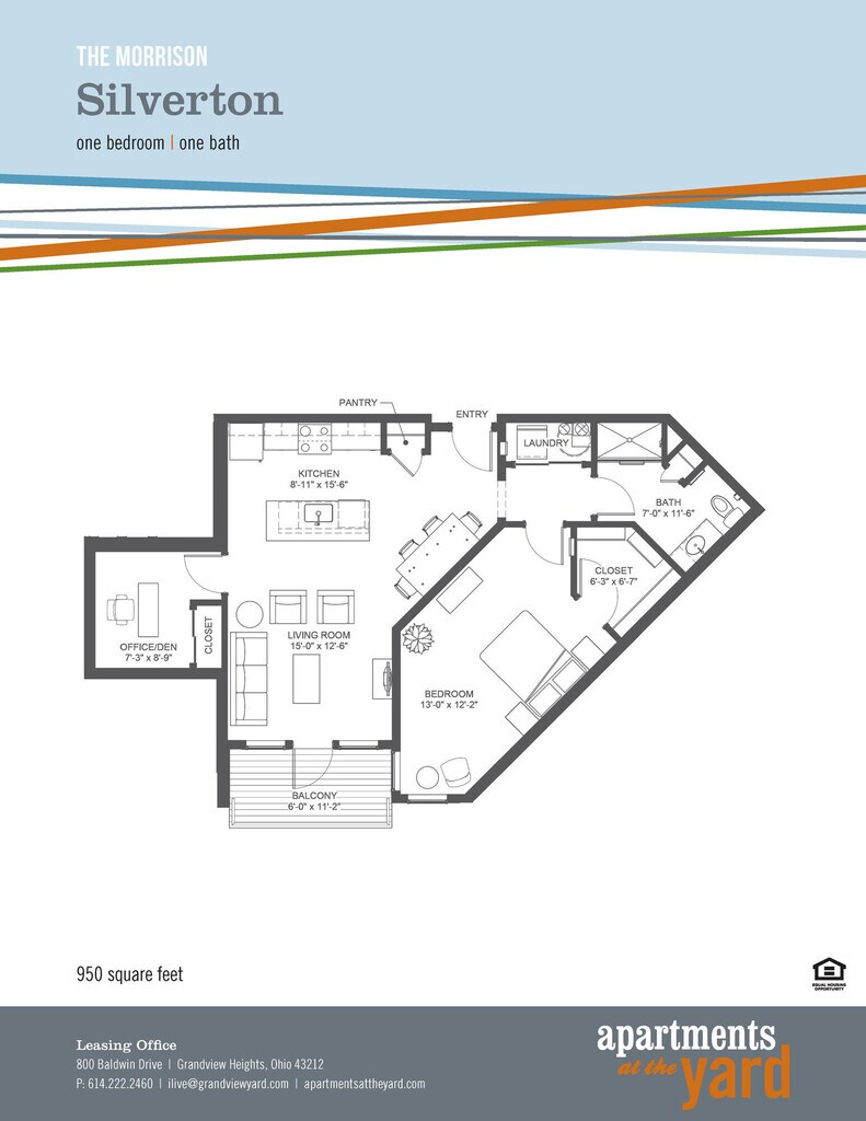 Silverton - Plano 1 Unidad de apartamento: 433Modelo de apartamento: Silverton$2,0021 Dormitorio, 1 Baño, 950 sq ftDisponible AhoraRiley