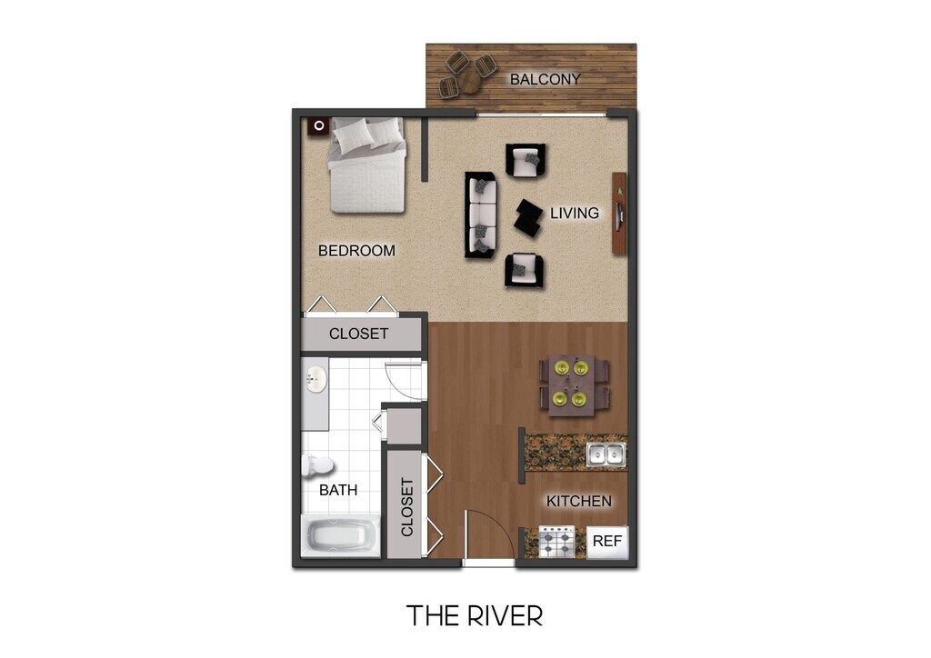 Modelo de apartamento: The River$1,276Estudio, 1 Baño, 565 sq ftDisponible AhoraThe River - Plano 1 Unidad de apartamento: 129Modelo de apartamento: The River$1,276Estudio, 1 Baño, 565 sq ftDisponible Ahora1 Dormitorio