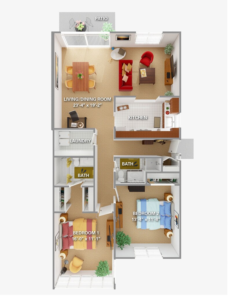 Modelo de apartamento: Cedar2 Dormitorios, 2 Baños, 1174 sq ftNo Disponible![]()