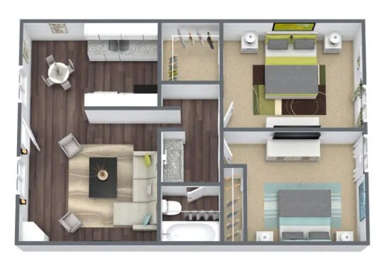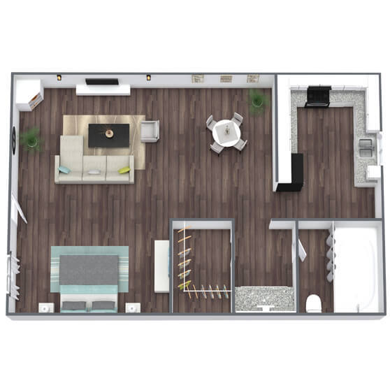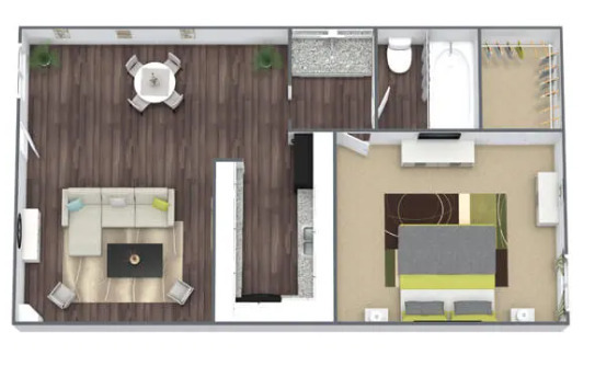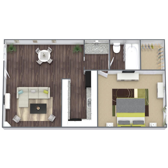 1 Dormitorio, 1 Baño, 550 pies²Disponible AhoraGalería del Modelo