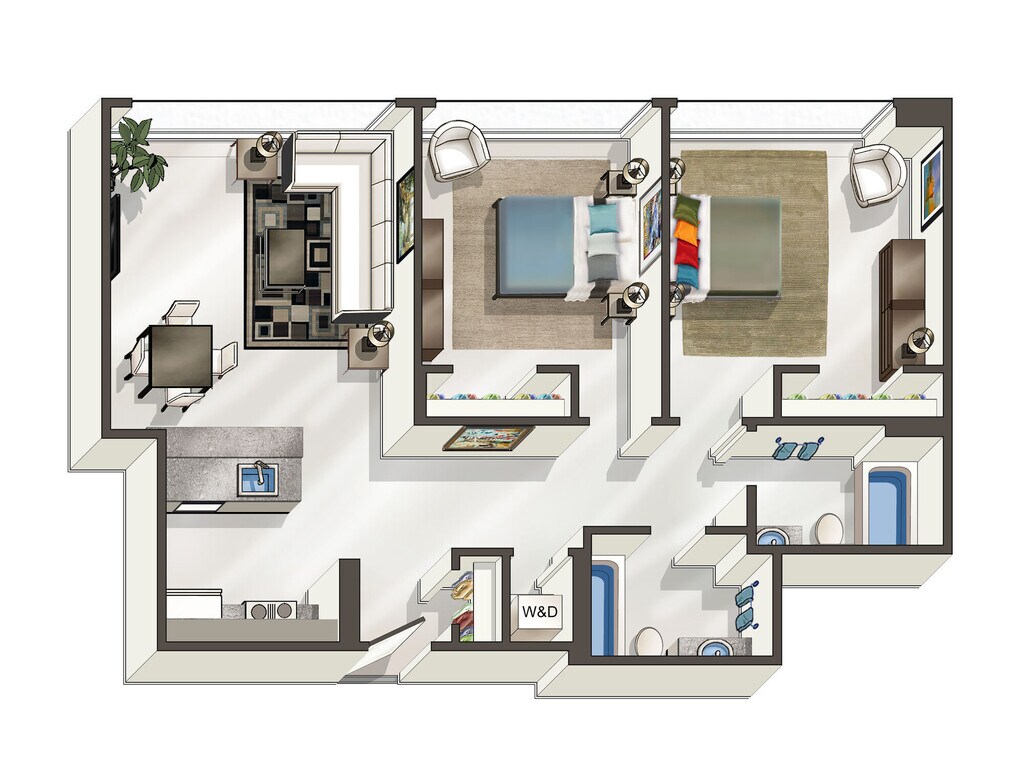 2 Dormitorios, 2 Baños, 1082 pies²El más grandeEsta opción tiene las unidades más grandes para este modeloGalería del Modelo