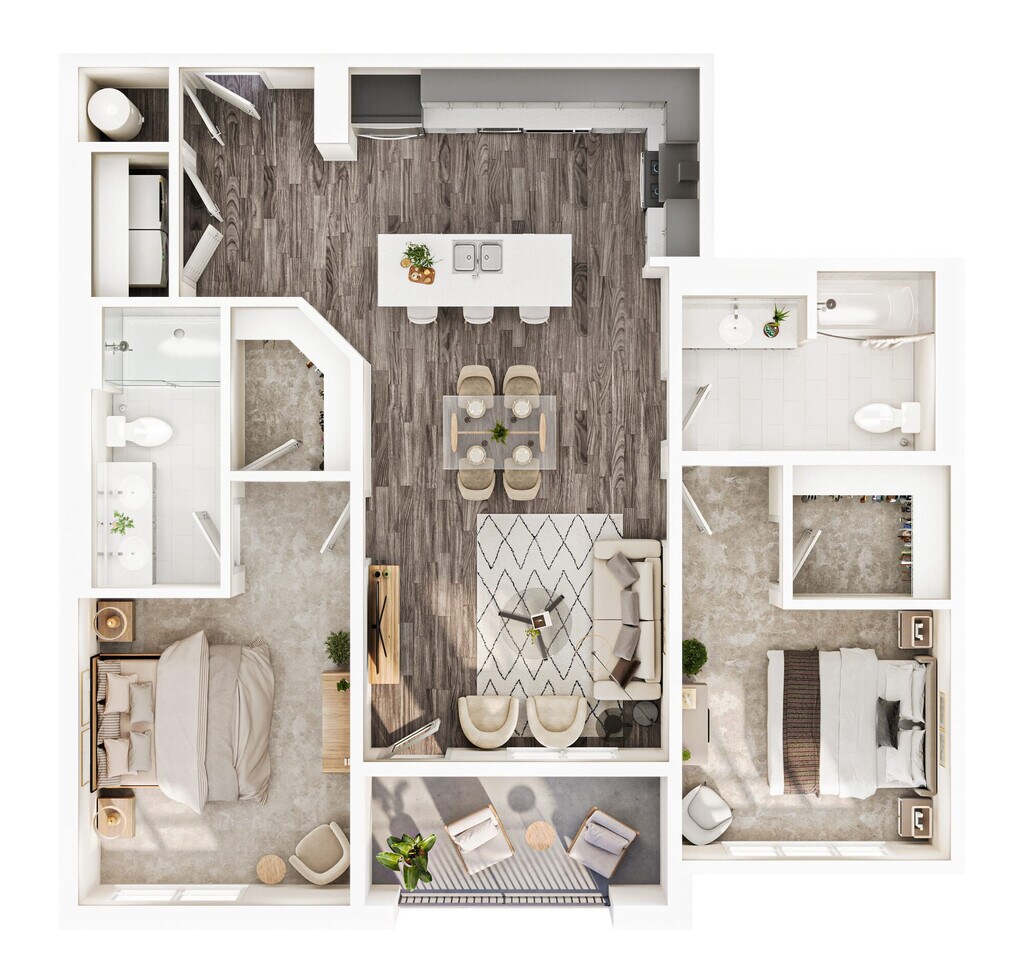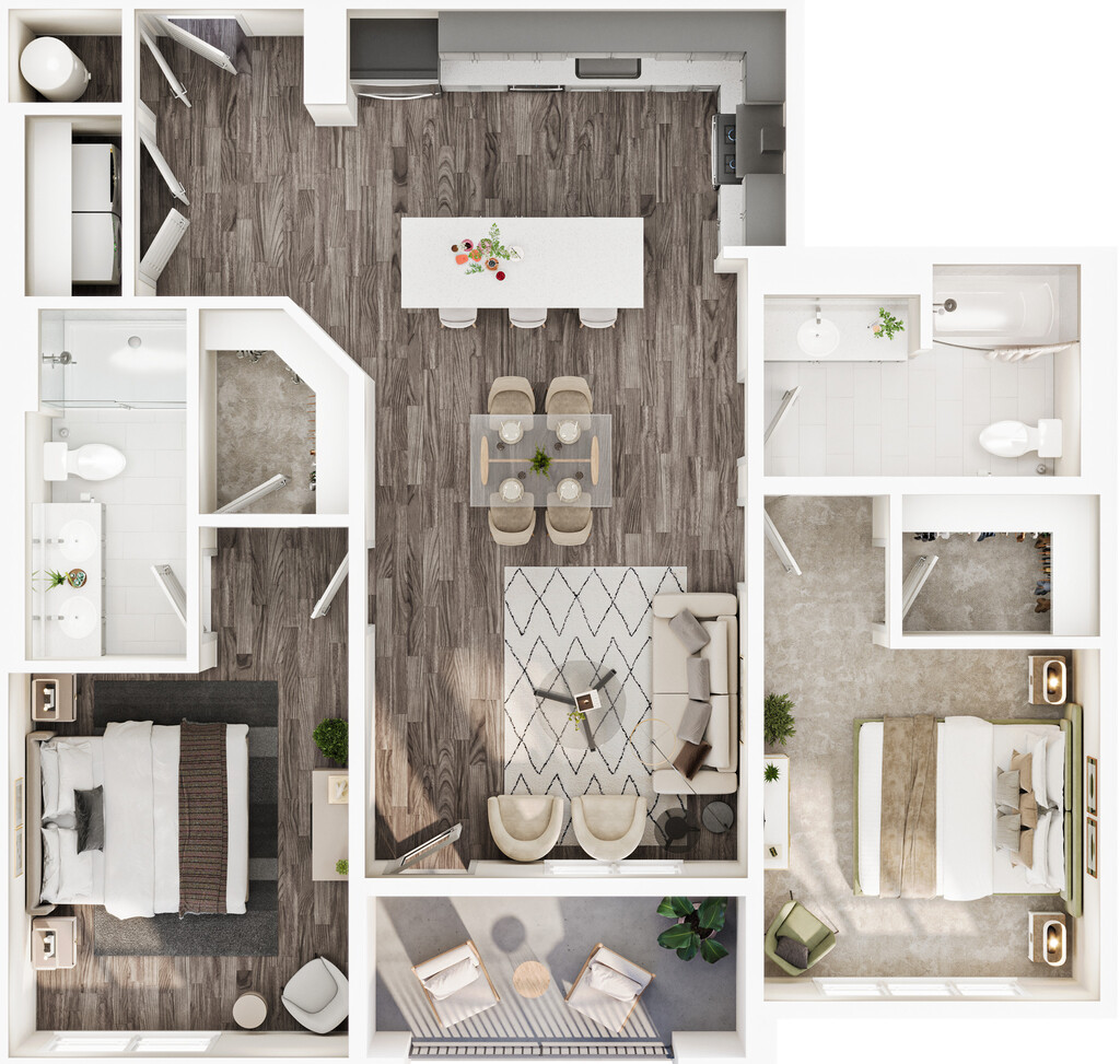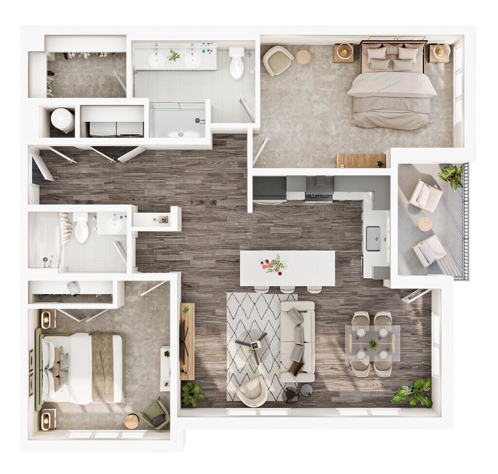 Modelo de apartamento: A2PDesde $1,5851 Dormitorio, 1 Baño, 900 sq ftDisponible Ahora![]()