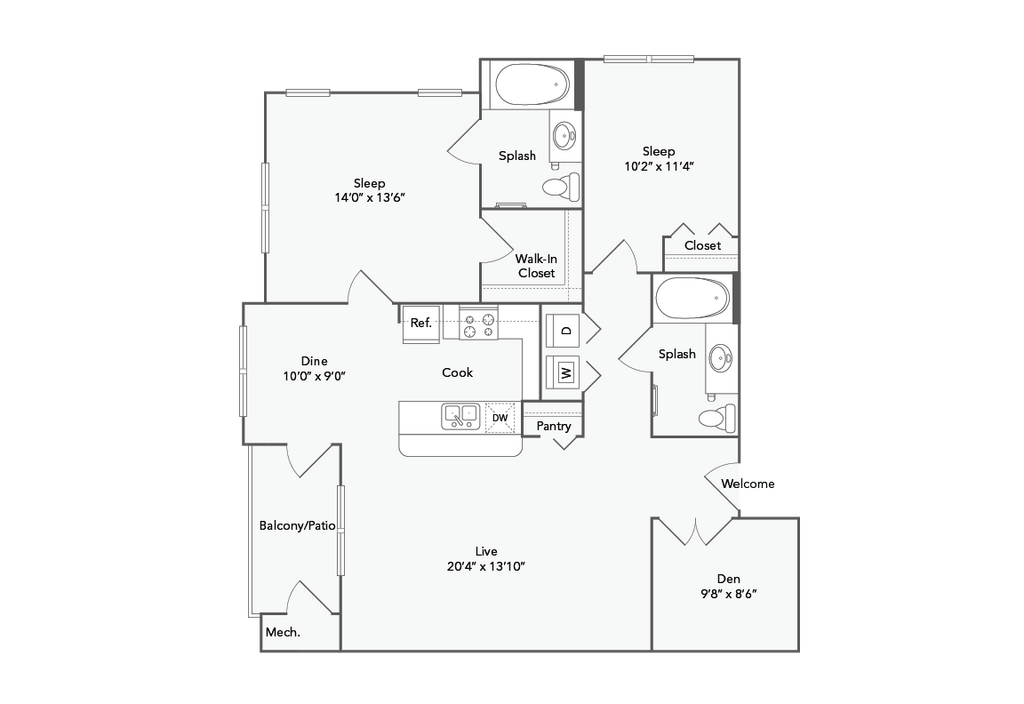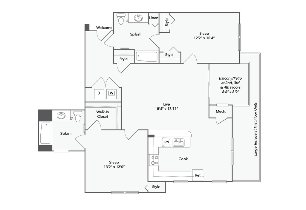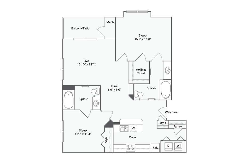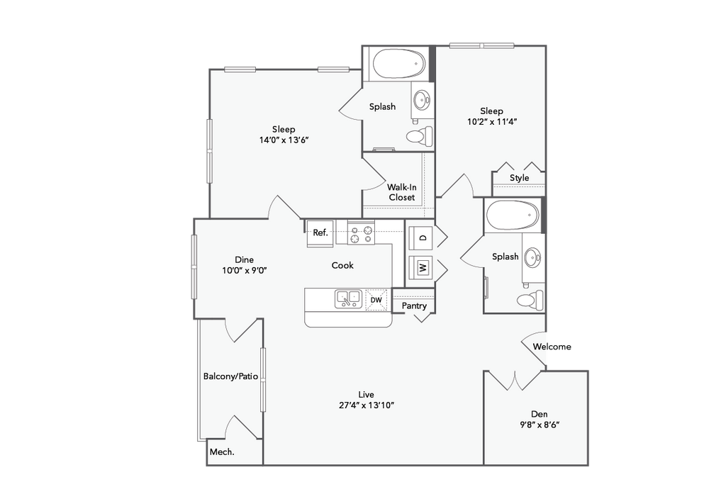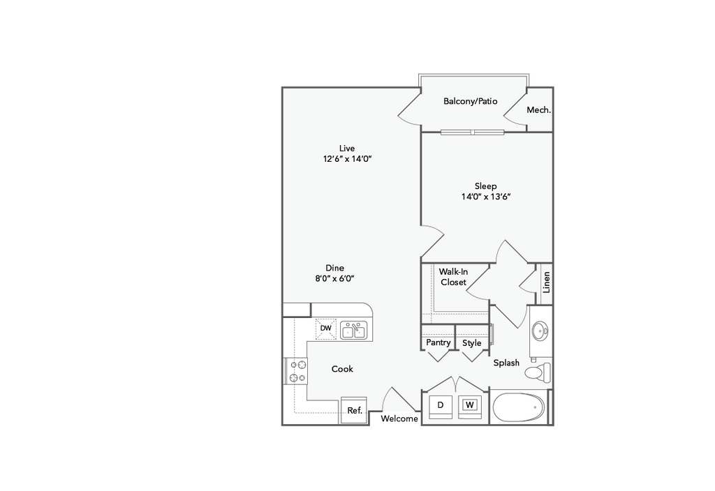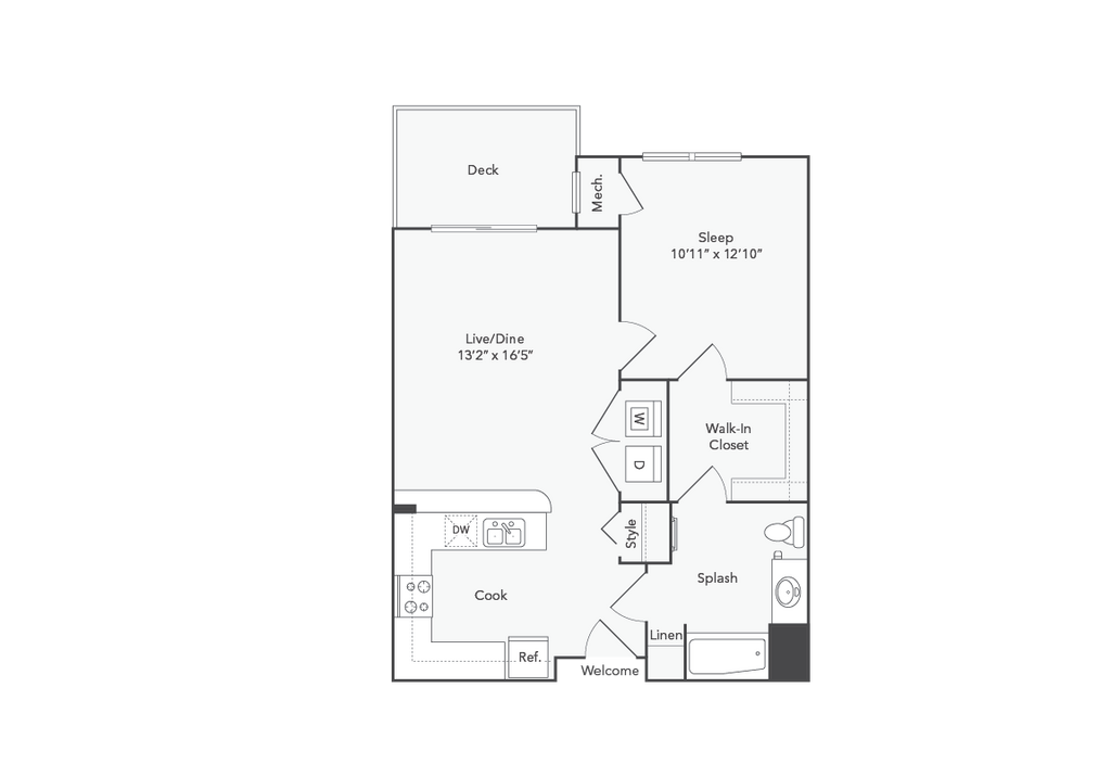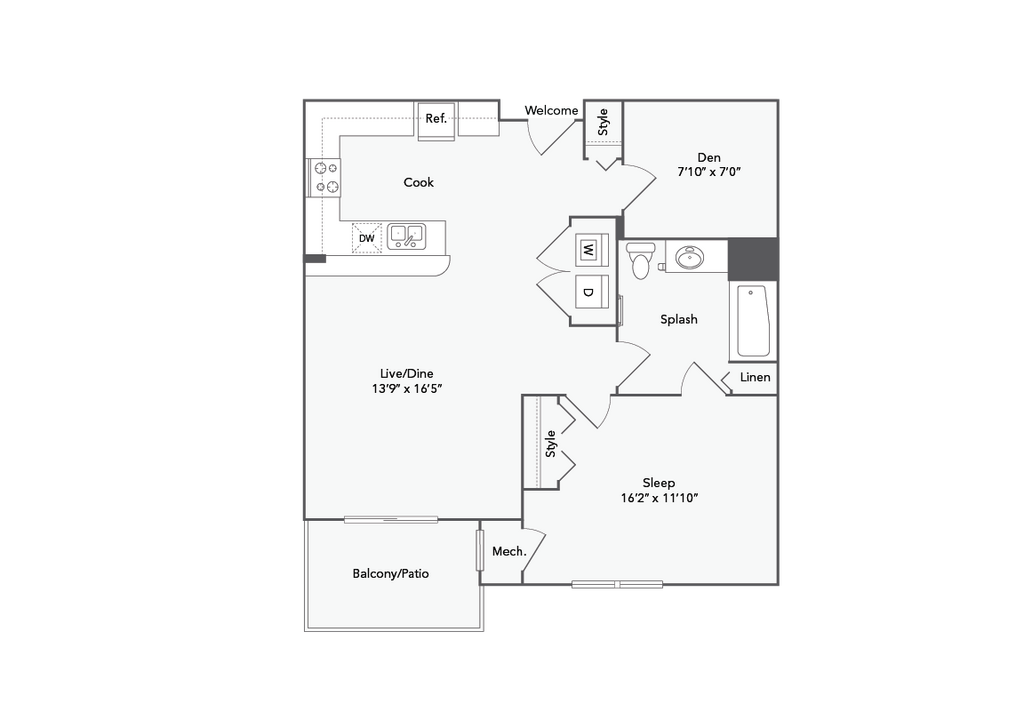 Modelo de apartamento: AdamsDesde $2,2991 Dormitorio, 1 Baño, 684 sq ftDisponible Ahora![]()