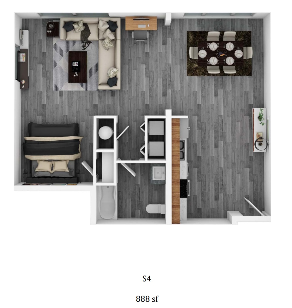 Modelo de apartamento: S4Llame para PreciosEstudio, 1 Baño, 888 sq ftNo DisponibleS4 - Plano 1 1 Dormitorio