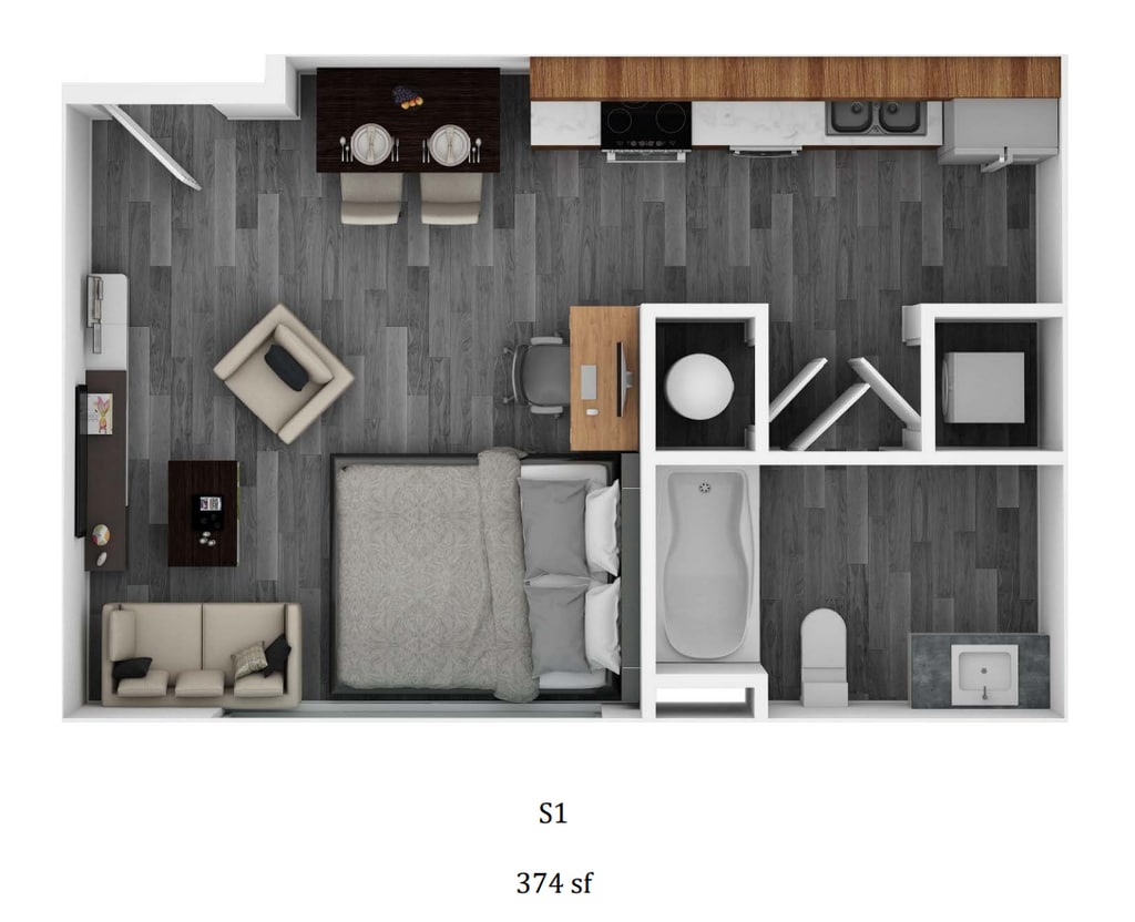 Modelo de apartamento: S1Llame para PreciosEstudio, 1 Baño, 374 sq ftNo DisponibleS1 - Plano 1 Plano: S4