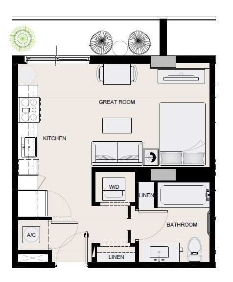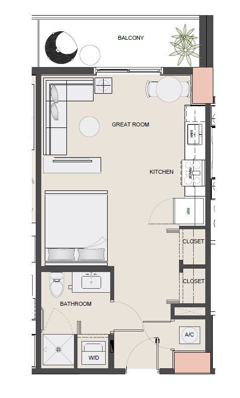 Modelo de apartamento: 0x1 - 420sqft - S5 - W120Desde $2,153Estudio, 1 Baño, 420 sq ftDisponible Ahora![]()