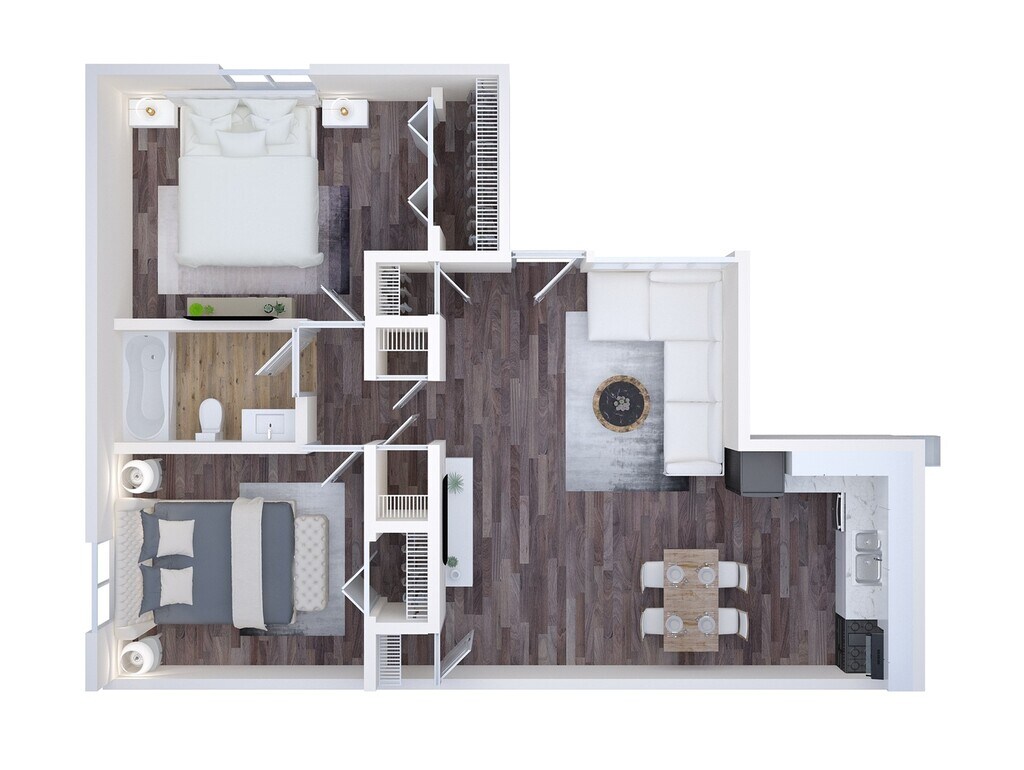 2 Dormitorios, 1 Baño, 856 pies²Disponible AhoraGalería del Modelo