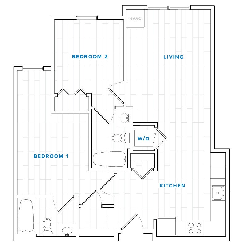 2 Dormitorios, 2 Baños, 803 pies²Precio Mensual TotalDisponible Aug 15, 2026Galería del Modelo