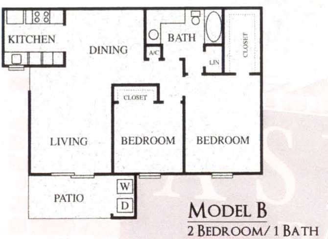 Modelo de apartamento: 2BR, 1BTH - BDesde $1,2432 Dormitorios, 1 Baño, 850 sq ftDisponible Ahora![]()