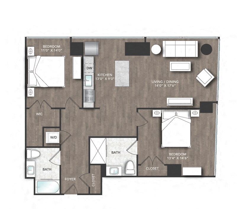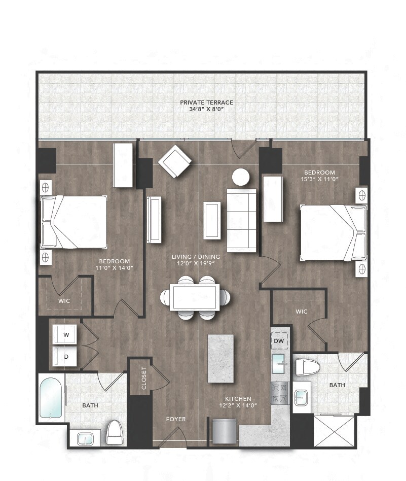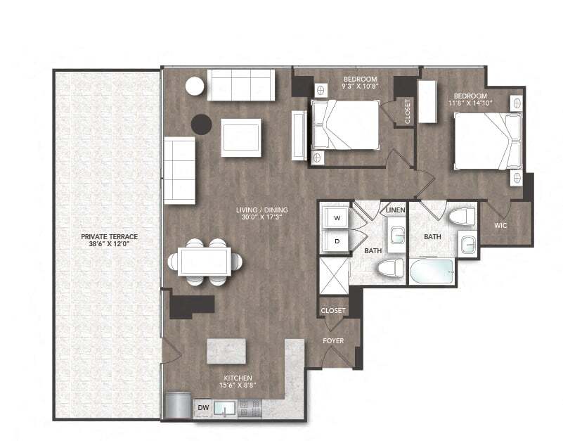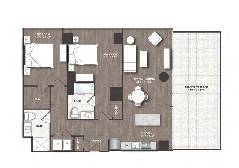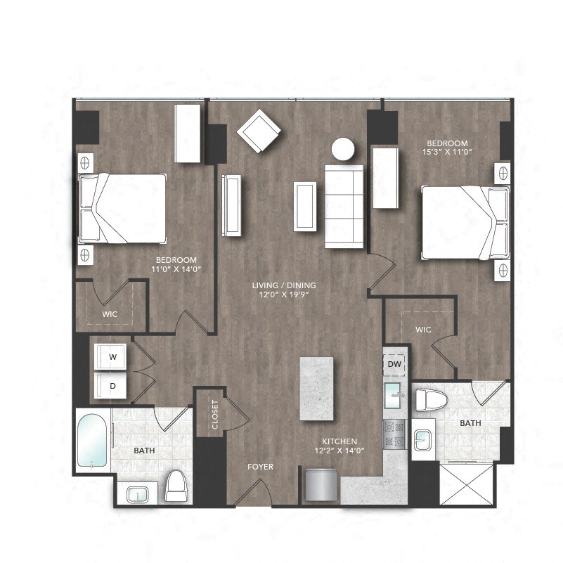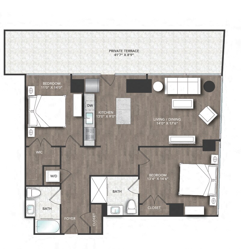 Modelo de apartamento: H UnitsDesde $2,9471 Dormitorio, 1 Baño, 754 sq ftDisponible Ahora![]()