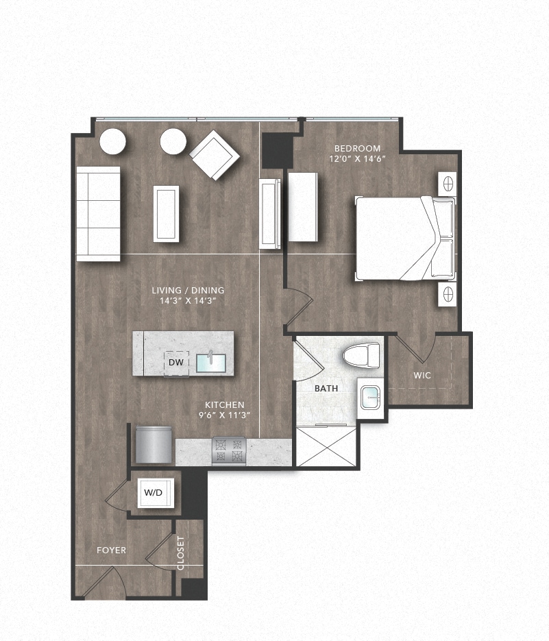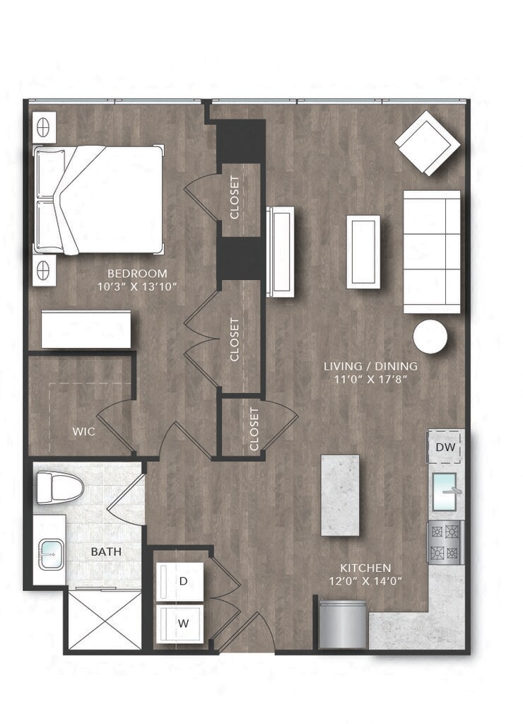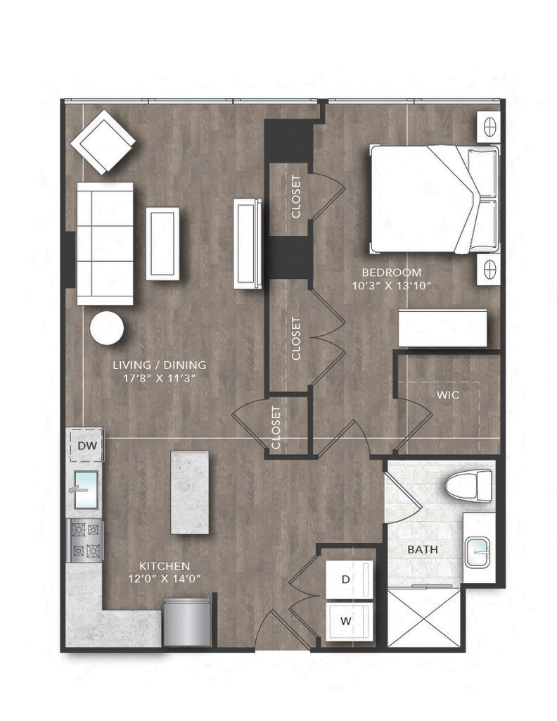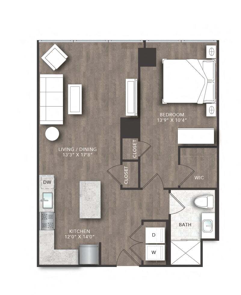1 Dormitorio, 1 Baño, 754 pies²Precio Mensual TotalDisponible AhoraGalería del Modelo