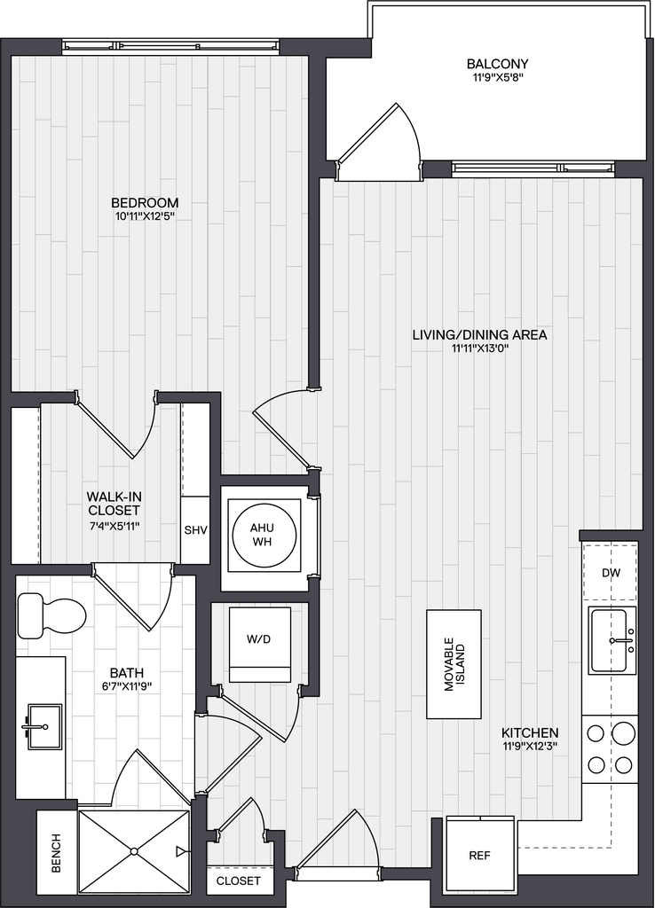 1 Dormitorio, 1 Baño, 658 pies²Disponible AhoraGalería del Modelo