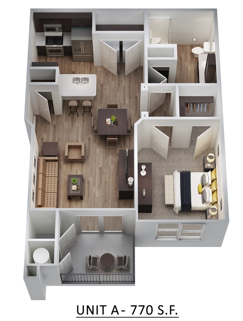 1 Dormitorio, 1 Baño, 770 pies²Disponible AhoraGalería del Modelo