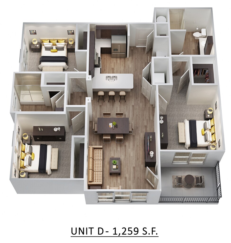3 Dormitorios, 2 Baños, 1259 pies²Disponible Dec 19Galería del Modelo