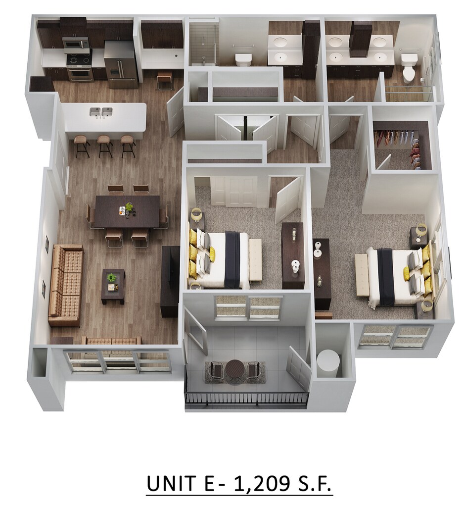 Modelo de apartamento: 2 BED, 2 BATH (E) - 1209 SFDesde $2,2002 Dormitorios, 2 Baños, 1209 sq ftDisponible Ahora![]()