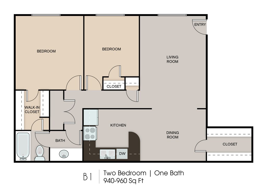 2 Dormitorios, 1 Baño, 940 pies²Galería del Modelo