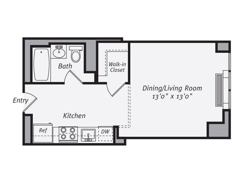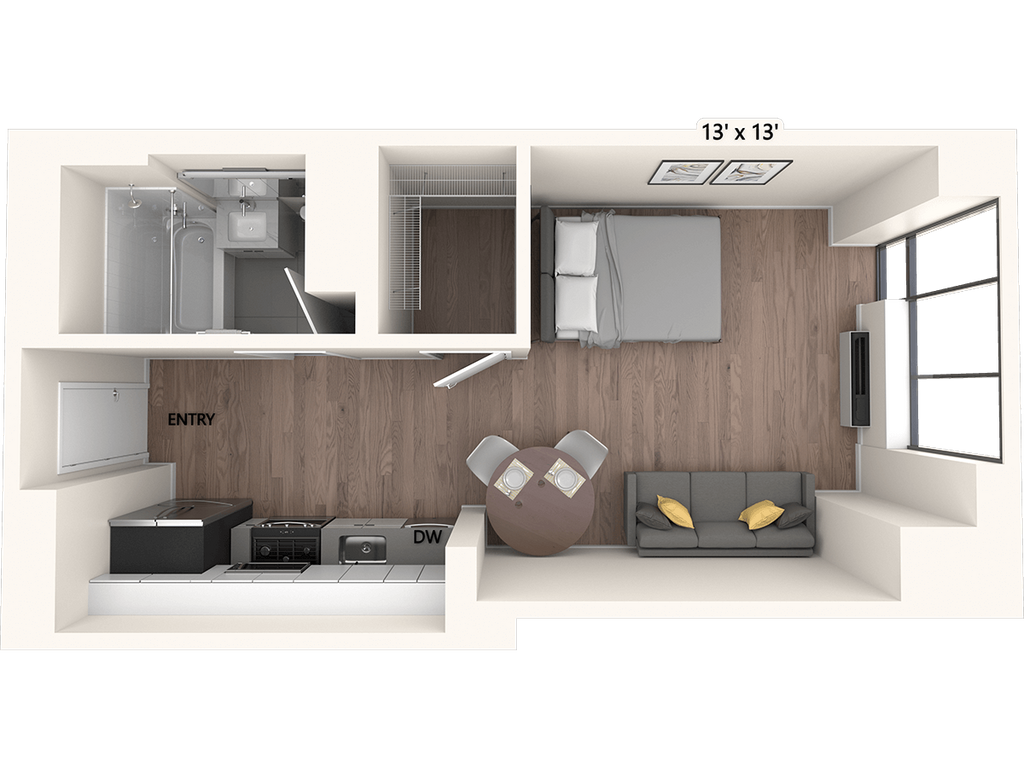 Modelo de apartamento: S1-211-811-and-212-812-513sqEstudio, 1 Baño, 513 sq ftDisponible March 18, 2026Los planos son representaciones artísticas. Todas las dimensiones son aproximadas. El producto y las especificaciones reales pueden variar en tamaño o detalle. No todas las características están disponibles en cada vivienda en alquiler. Por favor, consulta con un representante para obtener más detalles.
