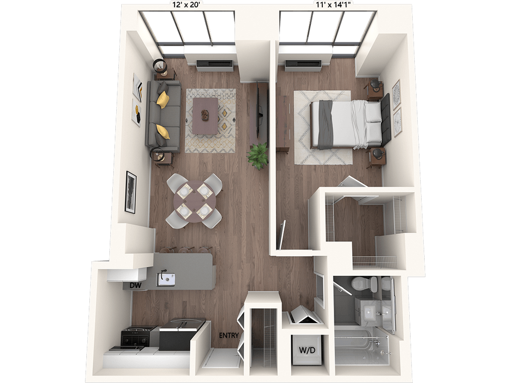 Modelo de apartamento: A1-217-817-and-218-818-701sq1 Dormitorio, 1 Baño, 702 sq ftDisponible December 6, 2025![]()