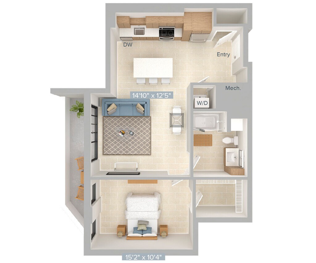 1 Dormitorio, 1 Baño, 733 pies²Disponible AhoraGalería del Modelo