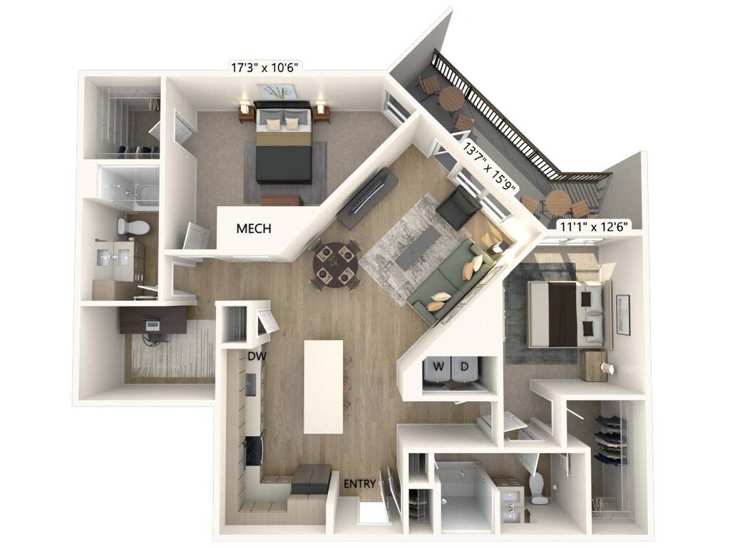 Modelo de apartamento: A1-704Desde $1,7901 Dormitorio, 1 Baño, 704 sq ftDisponible Ahora![]()