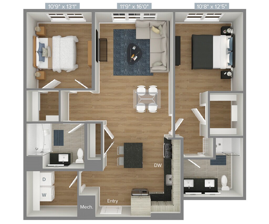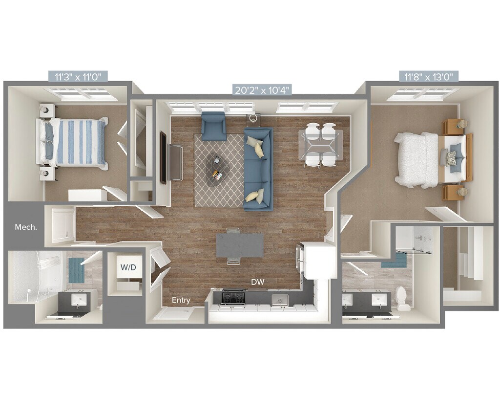 B2-1095 - Plano 1 Unidad de apartamento: 00C-3205Modelo de apartamento: B2-10952 Dormitorios, 2 Baños, 1095 sq ftDisponible AhoraB4-1154
