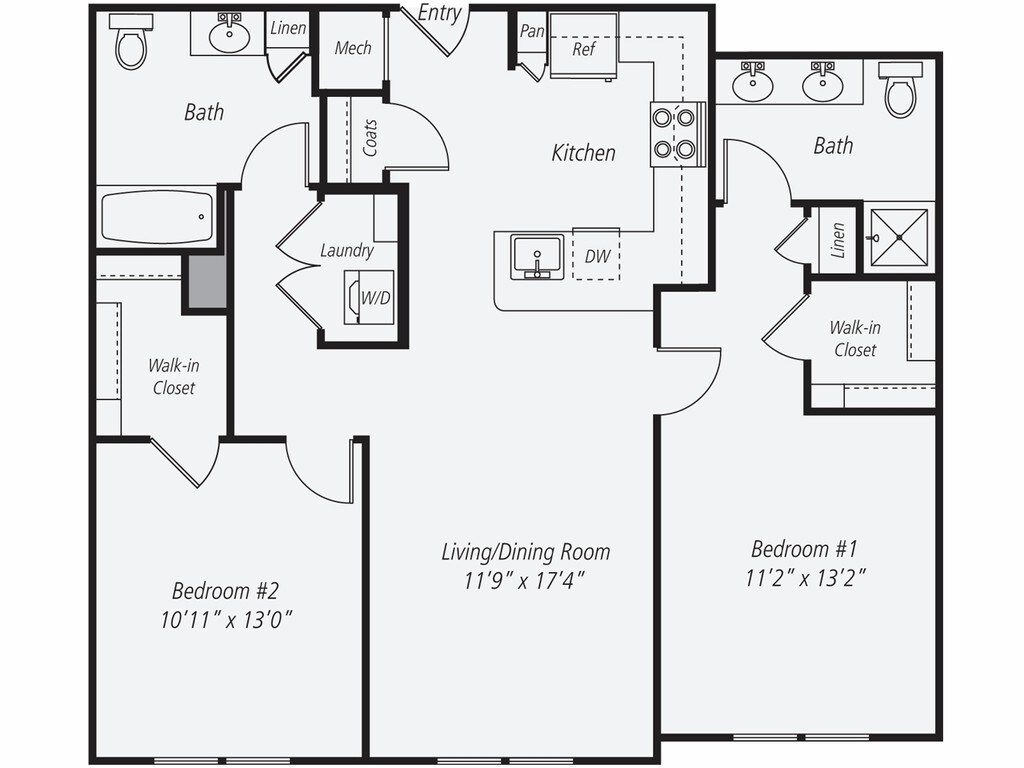 B2-1121 - Plano 1 Unidad de apartamento: 222Modelo de apartamento: B2-11212 Dormitorios, 2 Baños, 1121 sq ftDisponible AhoraB2-1108
