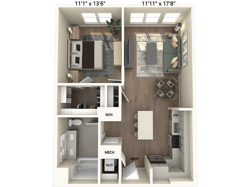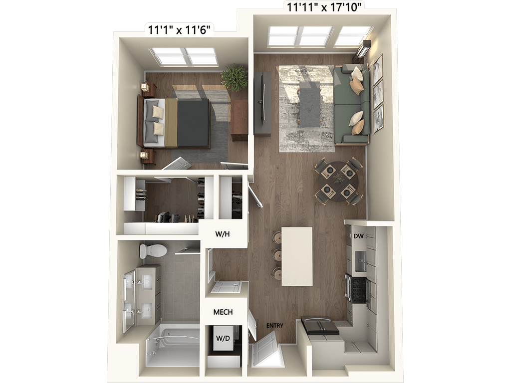 Modelo de apartamento: A1-Base$2,6101 Dormitorio, 1 Baño, 677 sq ftDisponible Ahora![]()