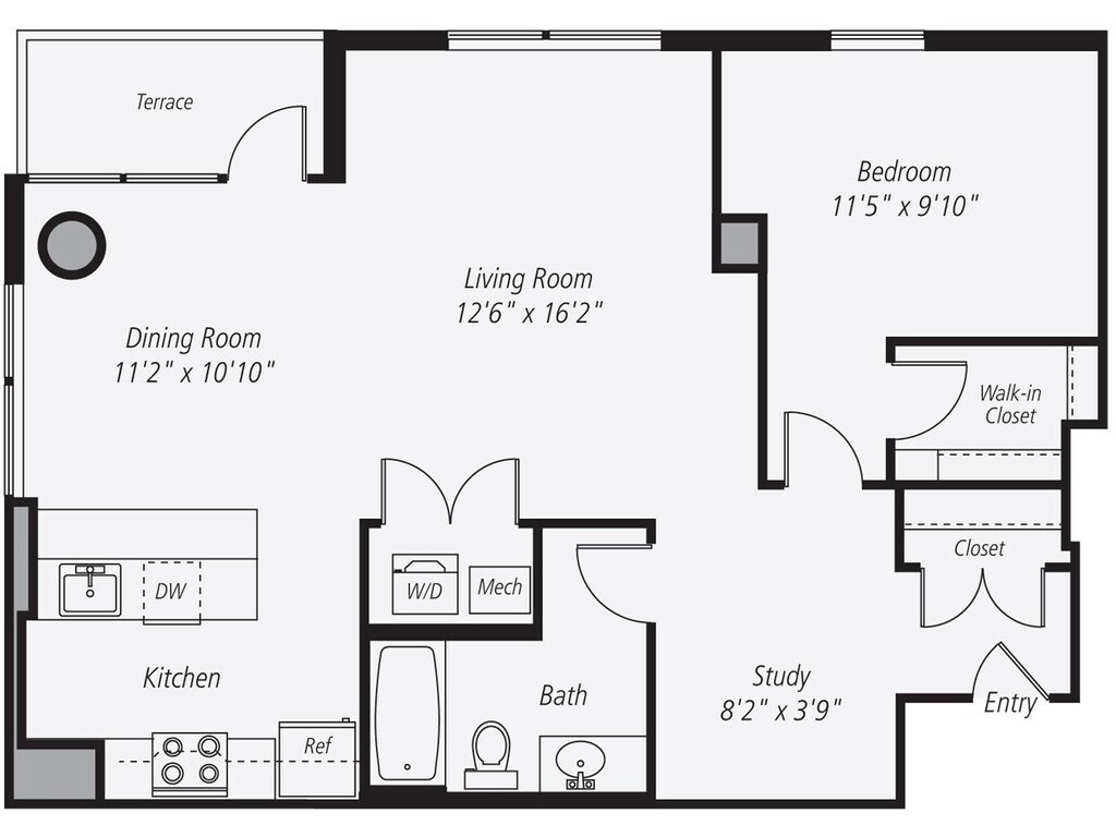 A12 - Plano 1 Unidad de apartamento: 00E-1914Modelo de apartamento: A12$3,3761 Dormitorio, 1 Baño, 800 sq ftDisponible AhoraA16P