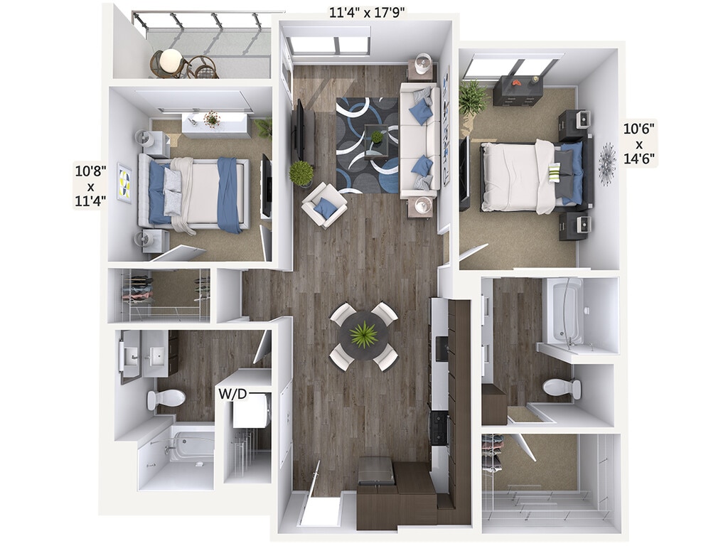 2 Dormitorios, 2 Baños, 1078 pies²Precio Mensual TotalDisponible Apr 15Precio Mensual Total