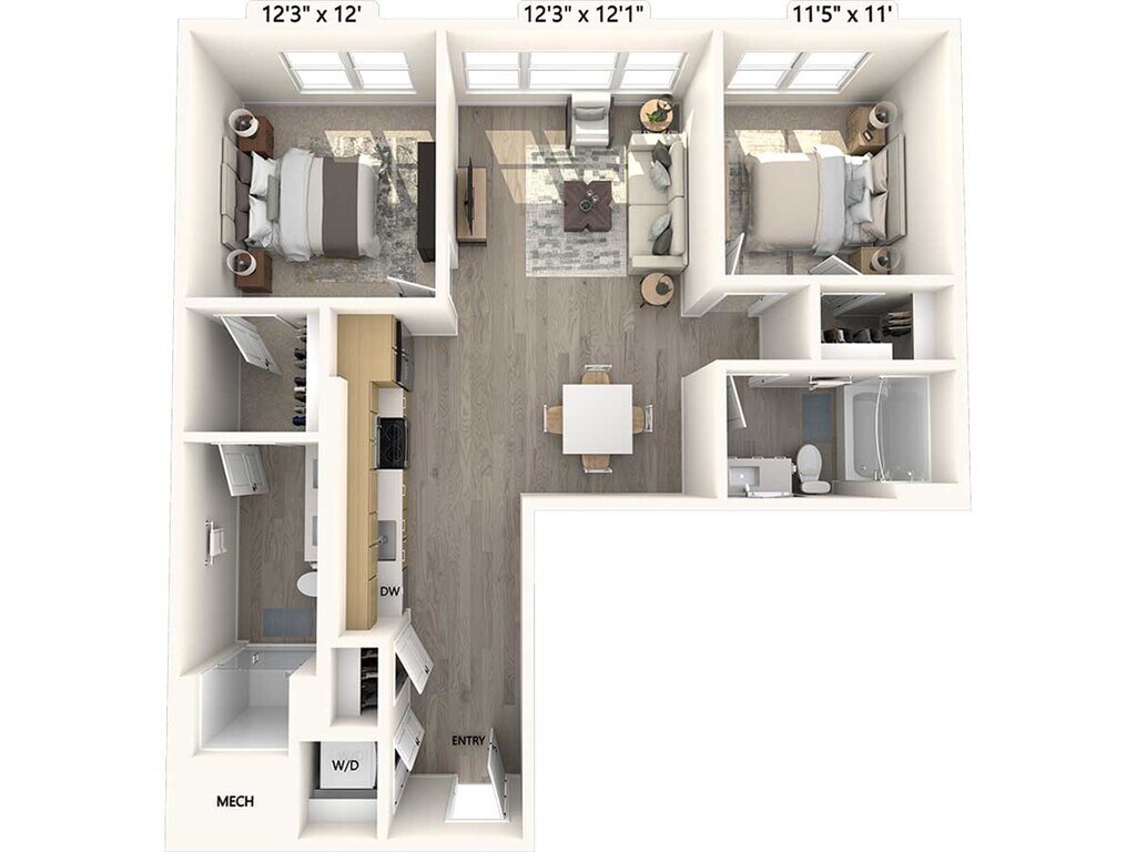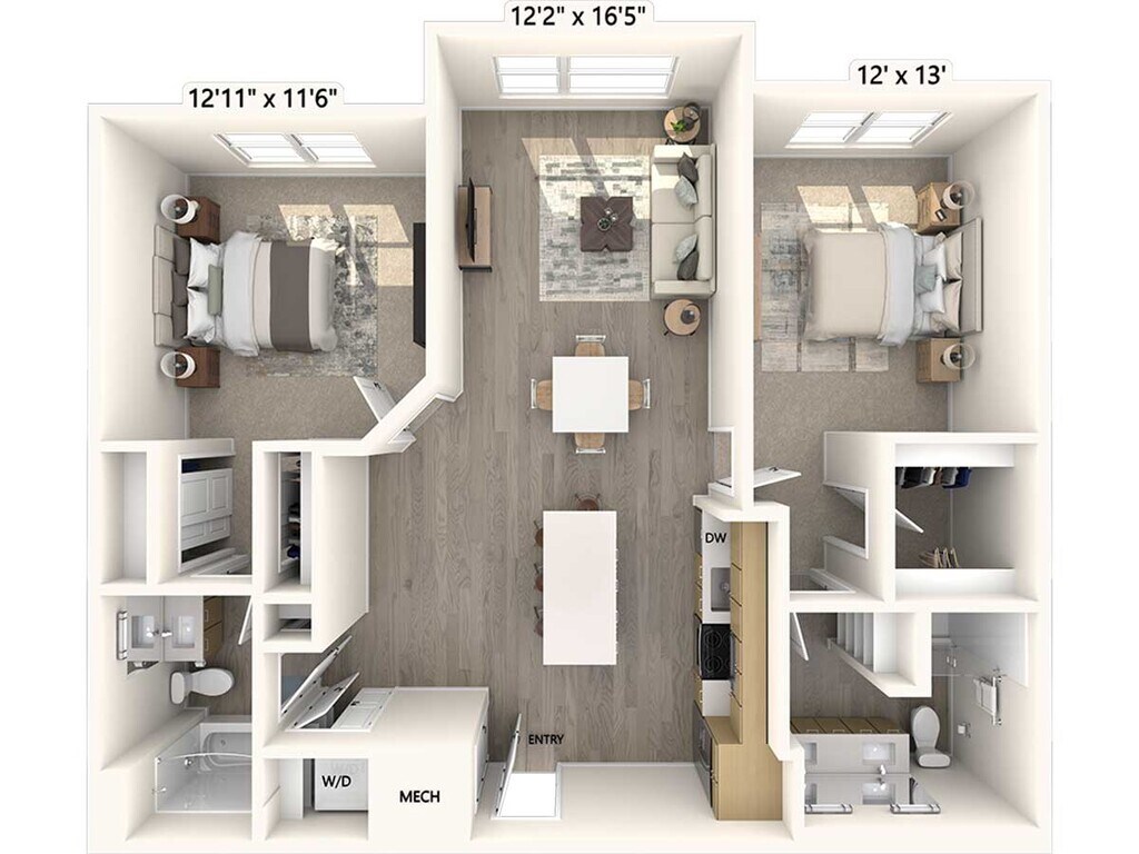 1 Dormitorio, 1 Baño, 800 pies²Precio Mensual TotalDisponible Mar 1Galería del Modelo