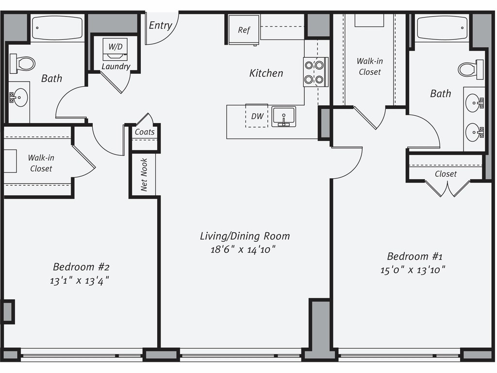 1 Dormitorio, 1 Baño, 825-860 pies²Disponible AhoraEl más grandeEsta opción tiene las unidades más grandes para este modeloGalería del Modelo